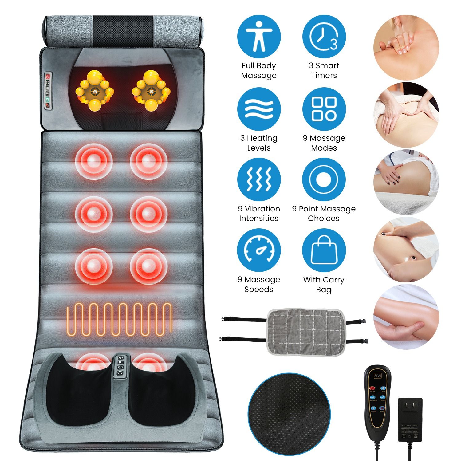 Massage Mat Specifications Function: Vibration(9 Massage Modes + 9 Points Vibration Selection + 9-Level Speeds + 9-Level Intensity); Heating(On Waist Part; 3 Levels); Timer[10Mins(Auto)/20Mins/ 30Mins]