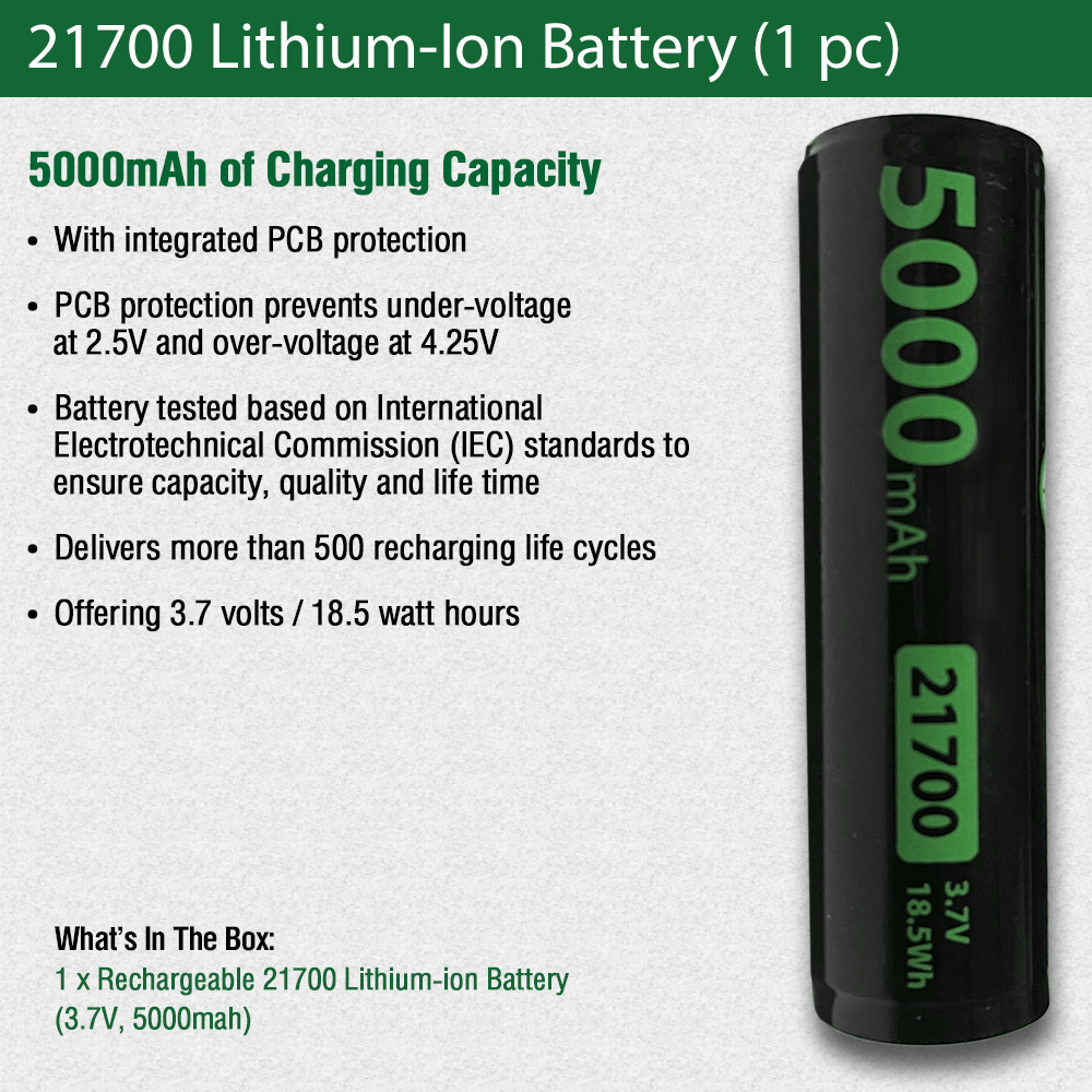 High capacity 21700 lithium-ion battery designed for flashlights and high drain devices delivering 5000mAh of reliable power. The EcoGear FX 21700 rechargeable battery are packed with an abundant amount of powerful energy. As our best 21700 battery, it provides up to 500 times of recharging cycles. The choice battery for 21700 LED flashlights and battery-powered professional equipment. When you think of high powered cell batteries, these 21700 lithium batteries deliver the power needed. The 21700 battery is commonly used in LED flashlights, electric bikes, vapes, work lights and various other modern devices. Features and Benefits: • Integrated PCB Protection • Lithium Ion 21700 cylindrical rechargeable battery • Internal PCB protection prevents under-voltage at 2.5V and over-voltage at 4.25V • Higher energy density and lower weight than many other rechargeable 21700 battery Battery Specifications: • Capacity: Nominal: 5000mAh, Minimum: 4900mAh • Internal PCB protection prevents under-voltage at 2.5V and over-voltage at 4.25V • Nominal Voltage: Average 3.7V • Cut-off Voltage: 2.5V • Cycle Performance: 90% of initial capacity at 400 cycles • Cycle life: > 500 cycles • Charge: Current = 0.5C (~1500mA) Voltage = 4.2 V End Current = 0.01 mA • Discharge: Current = 0.5C (~1500mA) End Voltage = 3.0V Product Dimensions • Diameter: 21 mm • Length: 74 mm These are the same lithium-ion batteries which were once top-selling on Amazon. Unfortunately, Amazon no longer allows the sale of many types of lithium-ion batteries including 21700 batteries.