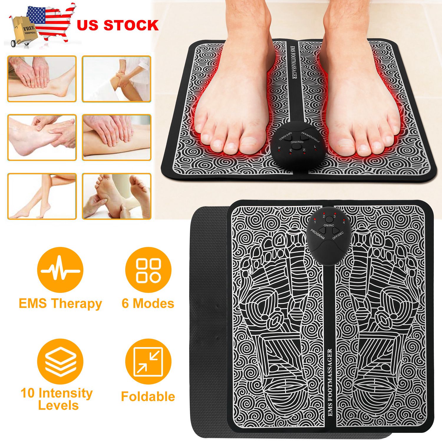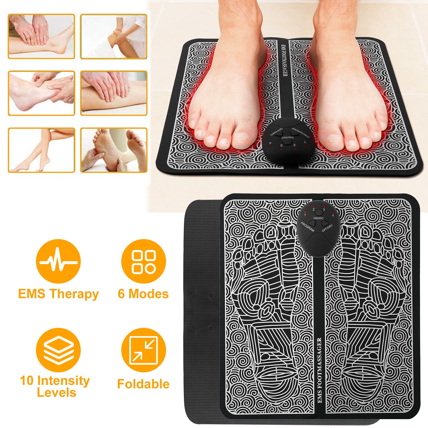 Home > EMS Foot Massage Pad Electric Stimulator Massager Unit Leg Reshaping Muscle Pain Relax Foldable Massage Mat w/ 6 Modes 10 Intensity Levels